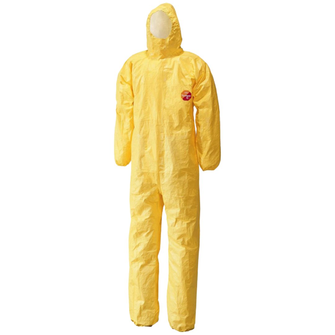 Tychem C Dupont Pvc Chemical Suit. Hooded coverall. Available in bright yellow for high visibility and in sizes SM to 3X.