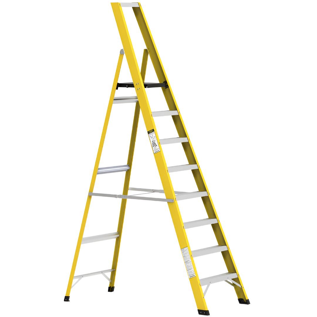 FRP Swing Type Platform Ladder Ideal for both Industrial & home purposes which are electrically or chemically exposed. This Platform Ladder offers a big platform for a safe and comfortable work environment, as well as a multi-functional holster top for keeping tools organized and within reach. The slip-resistant steps ensure added safety and confidence when moving up and down the ladder.