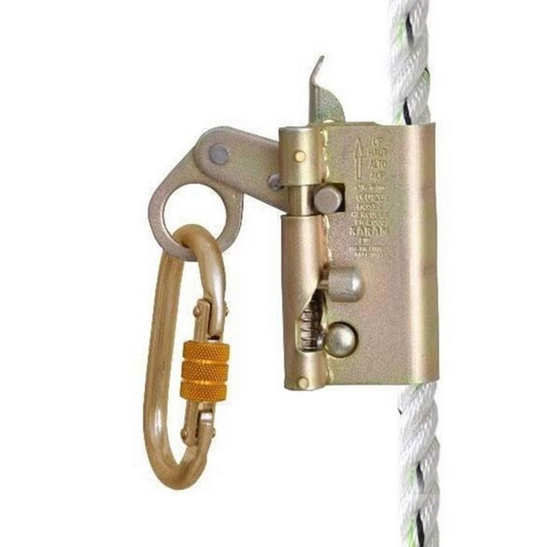 which moves freely along the polyamide twisted rope anchorage line (14mm to 16mm), attached at its eye with the user, while he moves up and down.